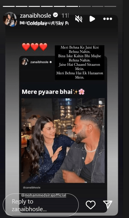जनाई ने सोशल मीडिया पर छाई अटकलों को खत्म करने के लिए सिराज के साथ अपनी एक तस्वीर शेयर की, जिसमें उन्होंने लिखा “मेरे प्यारे भाई”। कोल्डप्ले के ‘स्काई फुल ऑफ स्टार्स’ गाने के साथ शेयर की गई इस स्टोरी को सिराज ने भी रीपोस्ट किया। सिराज ने अपनी भावनाओं को शायराना अंदाज में व्यक्त करते हुए लिखा, “मेरी बहन के जैसी कोई बहना नहीं। बिना इसके कहीं भी मुझे रहना नहीं। जैसे है चांद सितारों में, मेरी बहना है एक हजारों में।” जनाई ने इस पोस्ट को एक लाल दिल के इमोजी के साथ रीशेयर करके अपने भाई के प्यार का जवाब दिया।