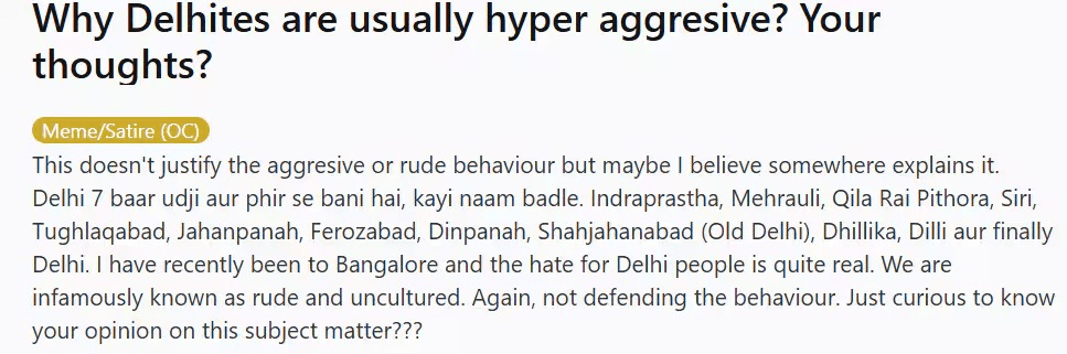 यूजर ने आगे लिखा, “हाल ही में मैं बेंगलुरु गया और वहां दिल्ली के लोगों के प्रति नफरत काफी स्पष्ट दिखी। हमें असभ्य और संस्कृतिहीन माना जाता है। मैं इस व्यवहार का बचाव नहीं कर रहा, बस जानना चाहता हूं कि आप इस विषय पर क्या सोचते हैं?”