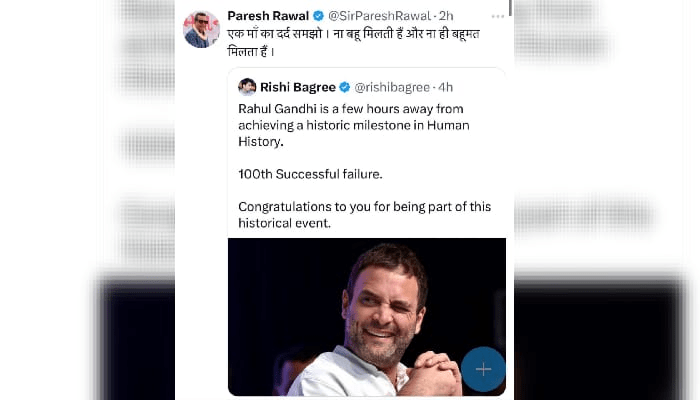 इस बीच, बॉलीवुड अभिनेता और राजनीतिक व्यक्तित्व परेश रावल ने कांग्रेस नेतृत्व पर एक चुटीला कटाक्ष किया। उन्होंने ट्वीट करते हुए लिखा, “एक मां का दर्द समझो। ना बहू मिलती है, ना बहुमत।” यह टिप्पणी सोनिया गांधी और राहुल गांधी की ओर इशारा करते हुए की गई। हालांकि अब यह पोस्ट डिलिट कर दी गई है।