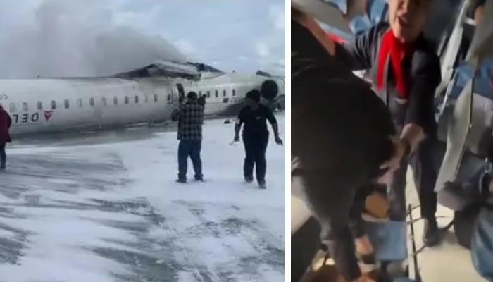 सोशल मीडिया पर वायरल हो रहे वीडियो में दिखाई दे रहा है कि यात्री उल्टे हुए विमान की छत पर चलकर बाहर निकल रहे हैं। एक फ्लाइट अटेंडेंट को यात्रियों को वीडियो न बनाने की हिदायत देते हुए सुना गया। आपातकालीन कर्मचारी तुरंत मौके पर पहुंचे, जहां विमान उल्टा पड़ा हुआ था और उस पर वीकेंड के विंटर स्टॉर्म की वजह से बर्फ जमी हुई थी।